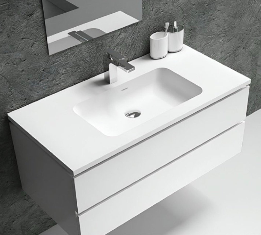 La série QUADRA est conçue pour les meubles de salle de bain de grande dimension. Son design rectangulaire profond offre un volume d’eau généreux. Fabriquée en Solid Surface blanc mat, elle résiste aux rayures et aux chocs quotidiens, idéale pour un usage familial soutenu.