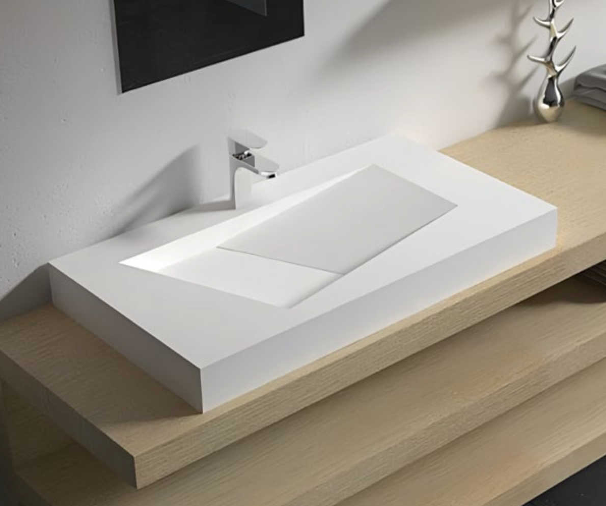 La vasque YURI se distingue par son profil extra-plat de seulement 97 mm. Fabriquée en matériel fort (Solid Surface), elle offre une rigidité structurelle parfaite malgré sa finesse. Son large plan de dépose est idéal pour poser vos accessoires de toilette. Ce modèle est particulièrement prisé par les architectes pour les projets de rénovation de standing à Casablanca et Rabat, cherchant à créer une sensation de légèreté visuelle absolue sans sacrifier la robustesse.