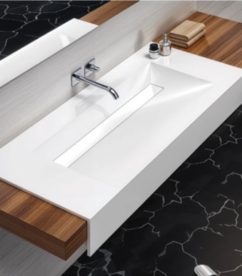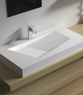 Vasque à encastrer carrée/large en Solid Surface. Dimensions : 800x460mm (L) ou 1000x480mm (XL). Confort et espace pour toute la famille.